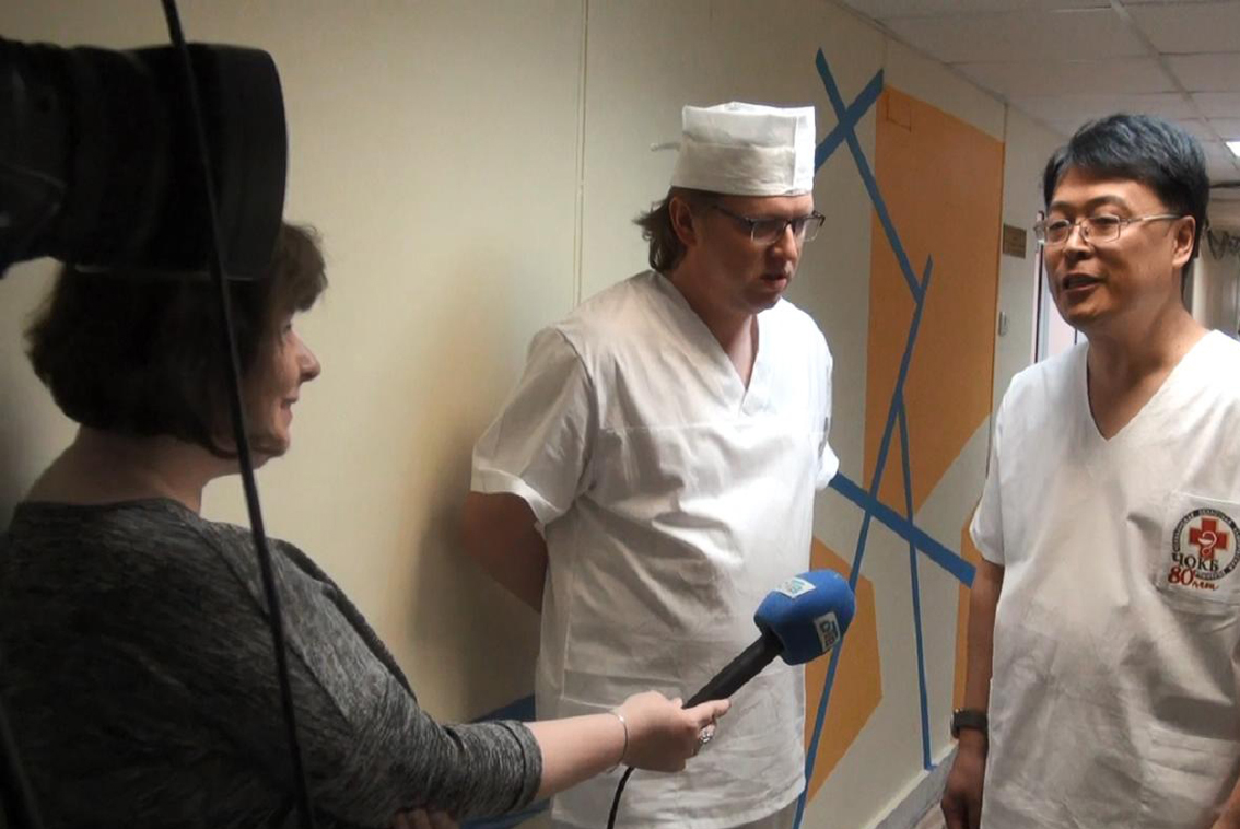 手術(shù)病房外,剛完成手術(shù)的李鵬主任作為中方專家接受俄羅斯當(dāng)?shù)仉娨暸_的采訪。他希望以后能夠通過更多的此類跨境醫(yī)療學(xué)術(shù)交流會來共同提升中俄兩地的醫(yī)療水平。采訪結(jié)束后,車?yán)镅刨e斯克州立醫(yī)院院方代表帶領(lǐng)李鵬主任及開立醫(yī)療人員參觀該院的消化科室,同時對消化科室的情況進(jìn)行了交流。離開之前,院方代表再次對李鵬主任及開立醫(yī)療人員表達(dá)了感謝。