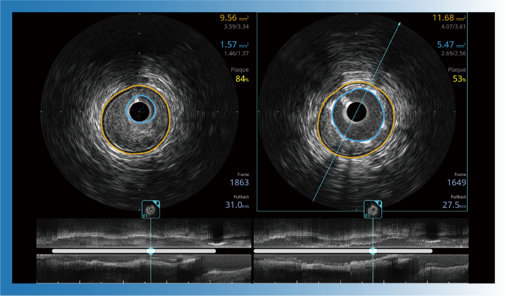 對比傳統(tǒng)IVUS導(dǎo)管成像,開立寬頻IVUS圖像的近場支架梁顯影更細膩,遠場中膜外血管仍清晰可辨,兼顧遠中近,兼顧分辨力與穿透深度